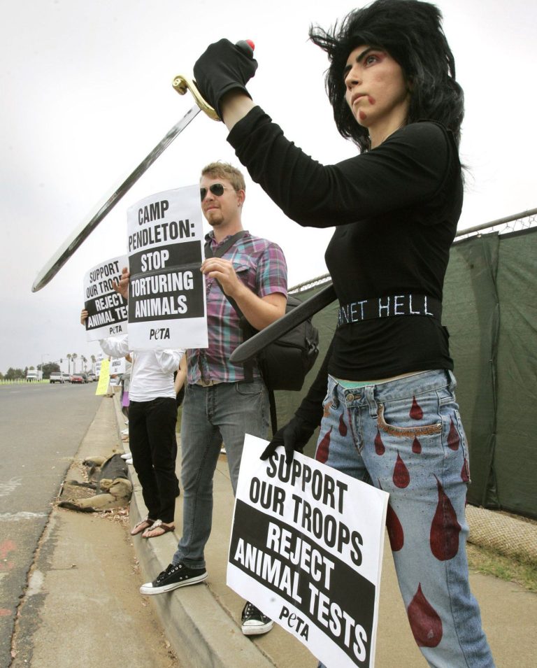 По техни данни тя е участвала в серия от протести. През 2009 г. е участвала впротест на РЕТА срещу използването на прасета във военни обучения. На демонстрацията пред военната база "Кемп Пендълтън" тя е носила перука и панталони, изрисувани с червена боя, държала е пластмасов меч.