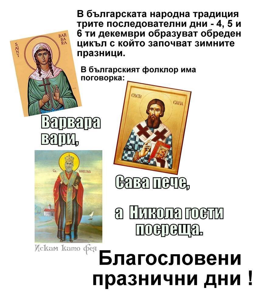 Света Варвара се чества на 4 декември, Свети Сава - на 5 декември днес, Свети Никола - на 6 декември. Народната митологията представя Св. Варвара като сестра на Свети Сава и на Свети Никола. Света Варвара и Свети Сава подготвят празника на Свети Никола, затова се казва: "Варвара вари, Сава пече (меси), Никола гости гощава".