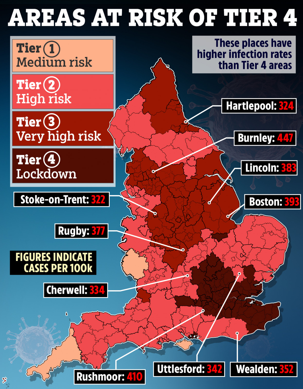 Здравният министър, Мат Ханкок обяви в кои райони на Обединеното Кралство от 26 декември(Boxing Day) ще почнат да действат новите правила. Това са: Съсекс, Оксфордшир, Съфолк, Норфолк, Кембриджшир, цялото графство Есекс (понастоящем само части от него са в четвърто карантинно ниво), Уейвърли и Хемпшир, с изключение на Ню Форест.