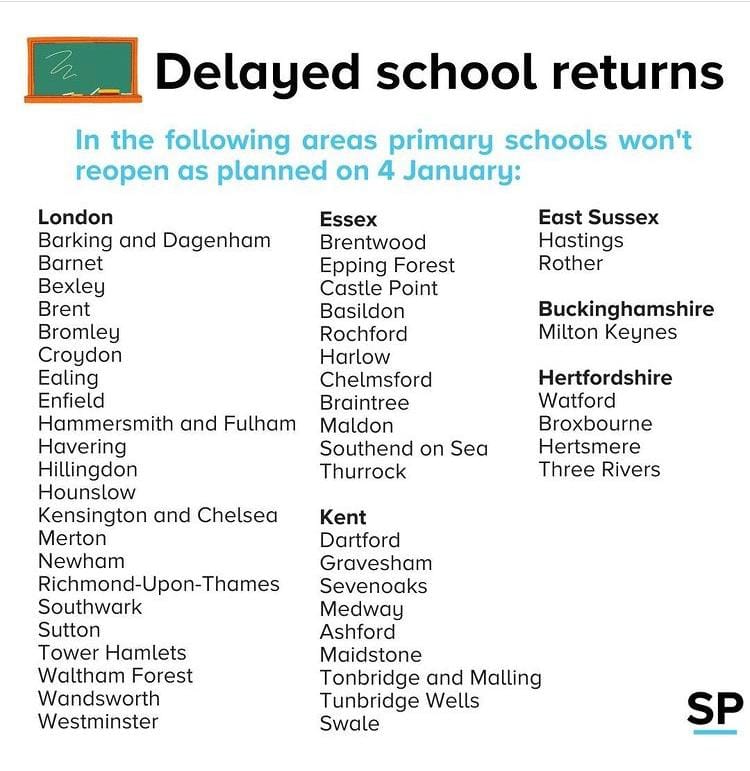 Днес стана окончателно ясно, че стотици хиляди ученици няма да започнат училище на време, след като правителството наложи забрана за отварянето им. Почти всички училища, които се намират в райони поставени под ограниченията на четвърто карантинно ниво (Tier 4), няма да отворят врати на 4-ти Януари.