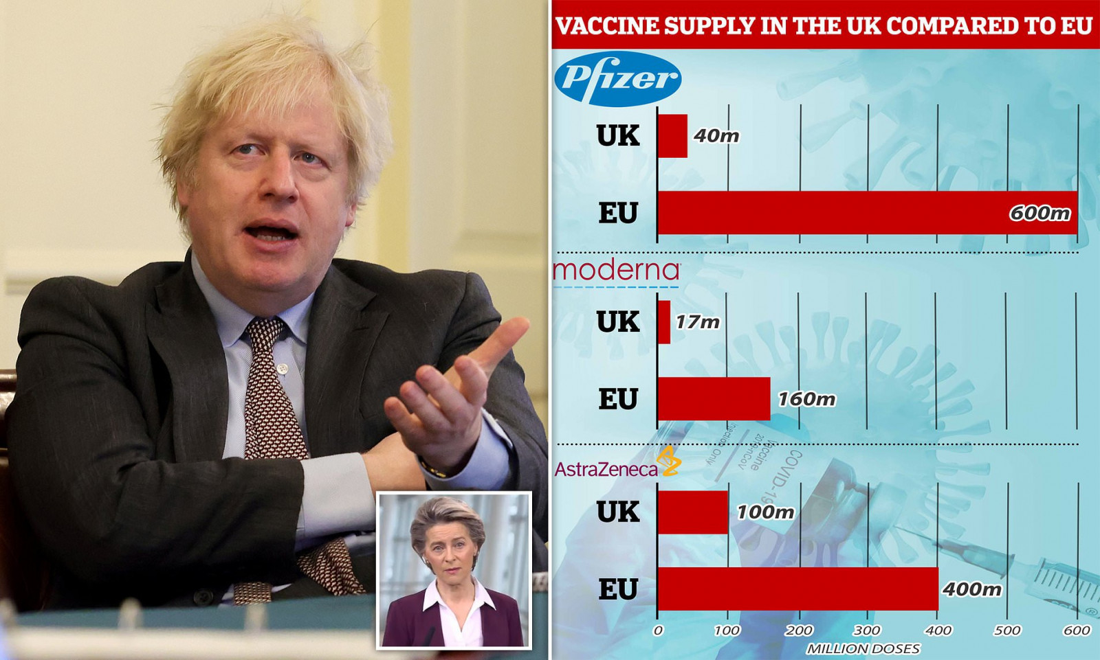 Производствените мощности на Pfizer-BioNTech са на територията на Европейския Съюз, оказва се че и голяма част от британската ваксина на AstraZeneca се произвежда на Континента и в последствие се изнася за Великобритания, която от 1-ви януари 2021 и след Брекзит, вече се явява трета, външна държава за общността на 27-те.