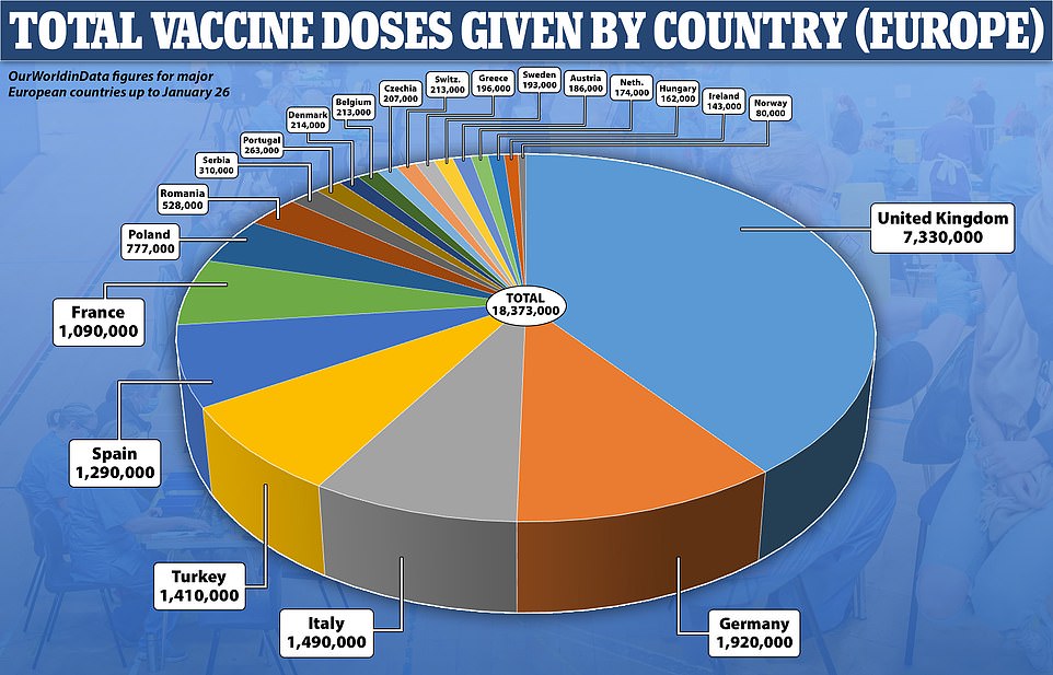 диаграма: брой направени ковид ваксини по държави до 26 януари. Безапелационно първо място за Великобритания с 7 330 000 ваксинации.