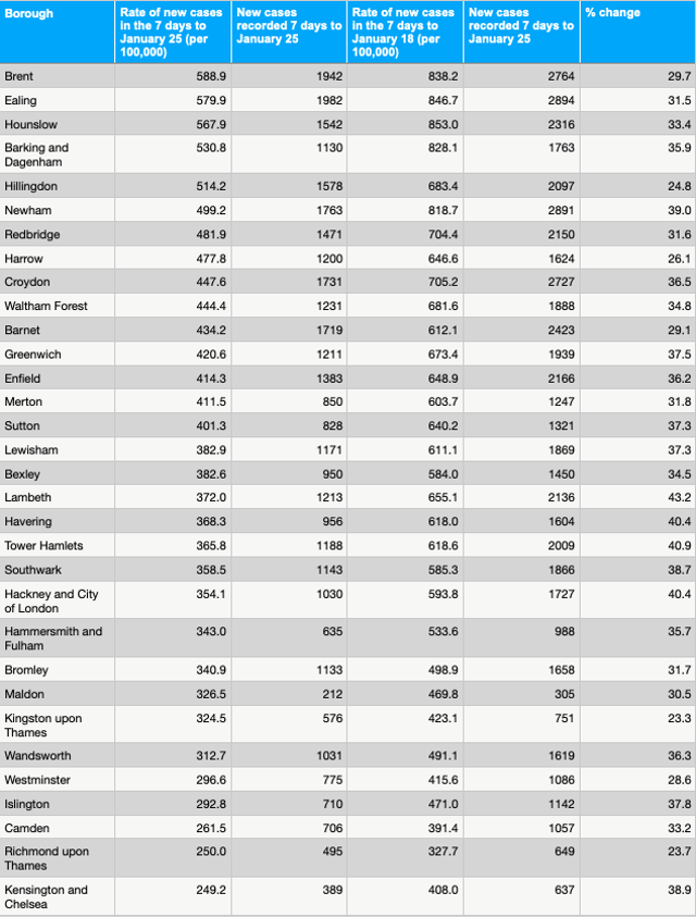 Най-високи нива на новозаразени подържа община Brent, следвана плътно от Илинг и Хунслоу, в дъното на таблицата с най-малко регистрирани нови случаи на коронавирус са Уестминстър, Ислингтън, Камдън, Ричмънд и Кенсингтън § Челси – при тях са регистрирани под 300 новозаразени на 100 000 души. Направеният брой ваксинации към момента на територията на Великобритания е близо 8 000 000. Това е повече от колкото всички направени ваксини в 27-те държави на европейския Съюз, взети заедно и може би е едностенно сравнимо само с нивата на ваксинациите в САЩ и Израел.