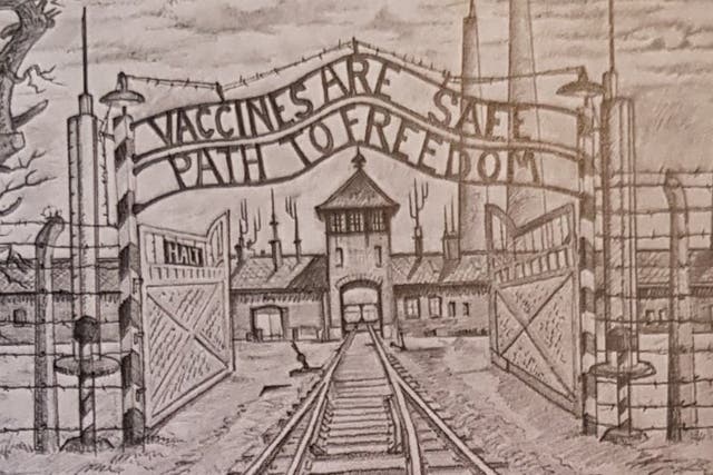 На флаерите има изображение на входа на нацисткия концентрационен лагер в Аушвиц, а текстът „Arbeit Macht Frei“ („Работата ще ви направи свободни” е заменен с фразата „Ваксината е безопасен път към свободата”.