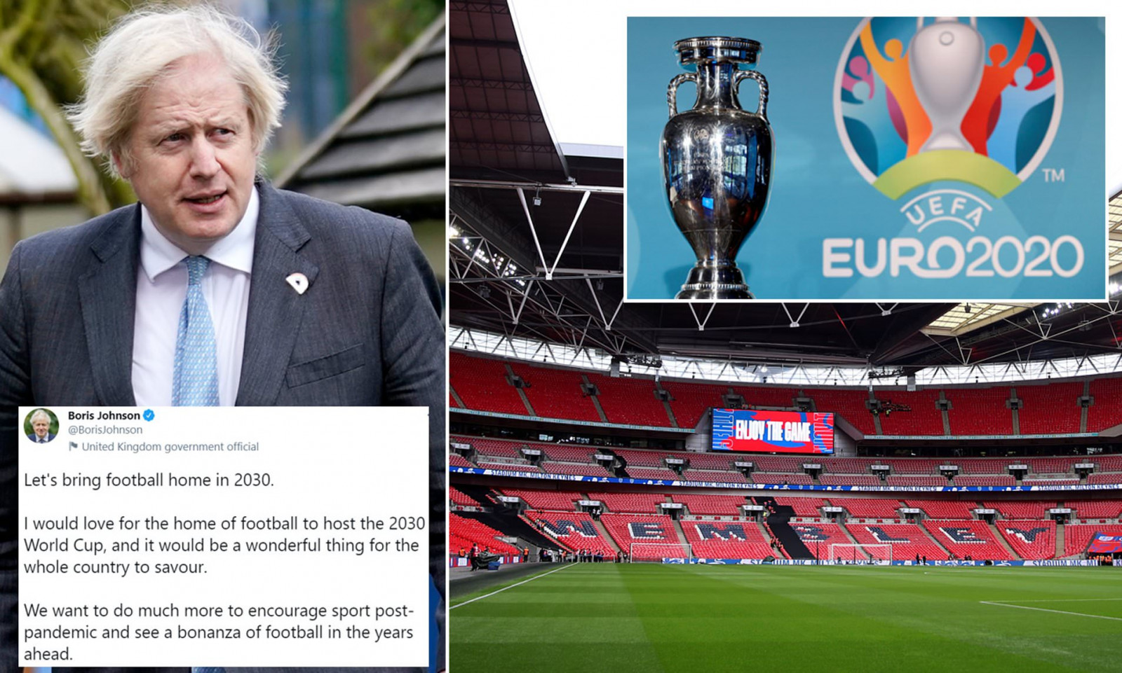 Борис Джонсън: Великобритания е домът на футбола, сега е точното време, много искаме да върнем футбола у дома и можем да организираме Световното по футбол през 2030 тук! Английската футболна асоциация приветства правителствената оферта да отдели 2.8 милиона лири за да може Великобритания да кандидатства за домакин на Мондиал 2030.
