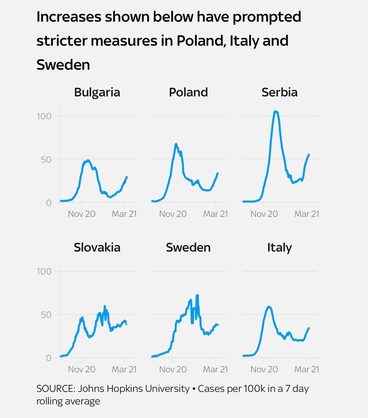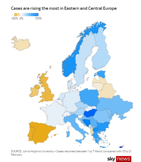 След анализа на Sky News беше установено, че в три четвърти от наблюдаваните 40 европейски страни коронавирусът отново се активизира, като особено осезаемо е това в страните от Централна и Източна Европа. Девет от страните са показали повече или по-малко намаляване на случаите, а особено забележимо е затихването в три държави – Португалия, Испания и Великобритания, като в Испания заразяванията са даже по-ниски от тези през септември.
