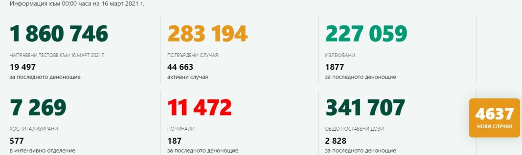 Общо 7269 пациенти с коронавирус са в болница - рекорден брой от началото на пандемията в нашата страна, от които 577 са в интензивни отделения (най-голям брой от 15-и декември 2020г.). Общият брой на поставените дози ваксини у нас е 341 707, като новите за денонощие са 2828. С две дози са ваксинирани общо 59 994.