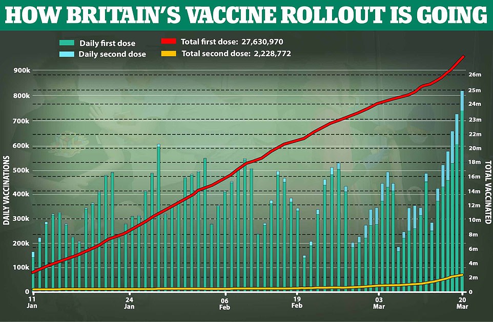 Над 27,6 милиона души във Великобритания - повече от половината възрастно население - досега са получили поне една доза ваксина. Борис Джонсън, който получи първата си доза от ваксината на AstraZeneca в петък, каза: "Благодаря на всички участващи и моля, излезте напред за ваксина, когато бъдете поканени да го направите."