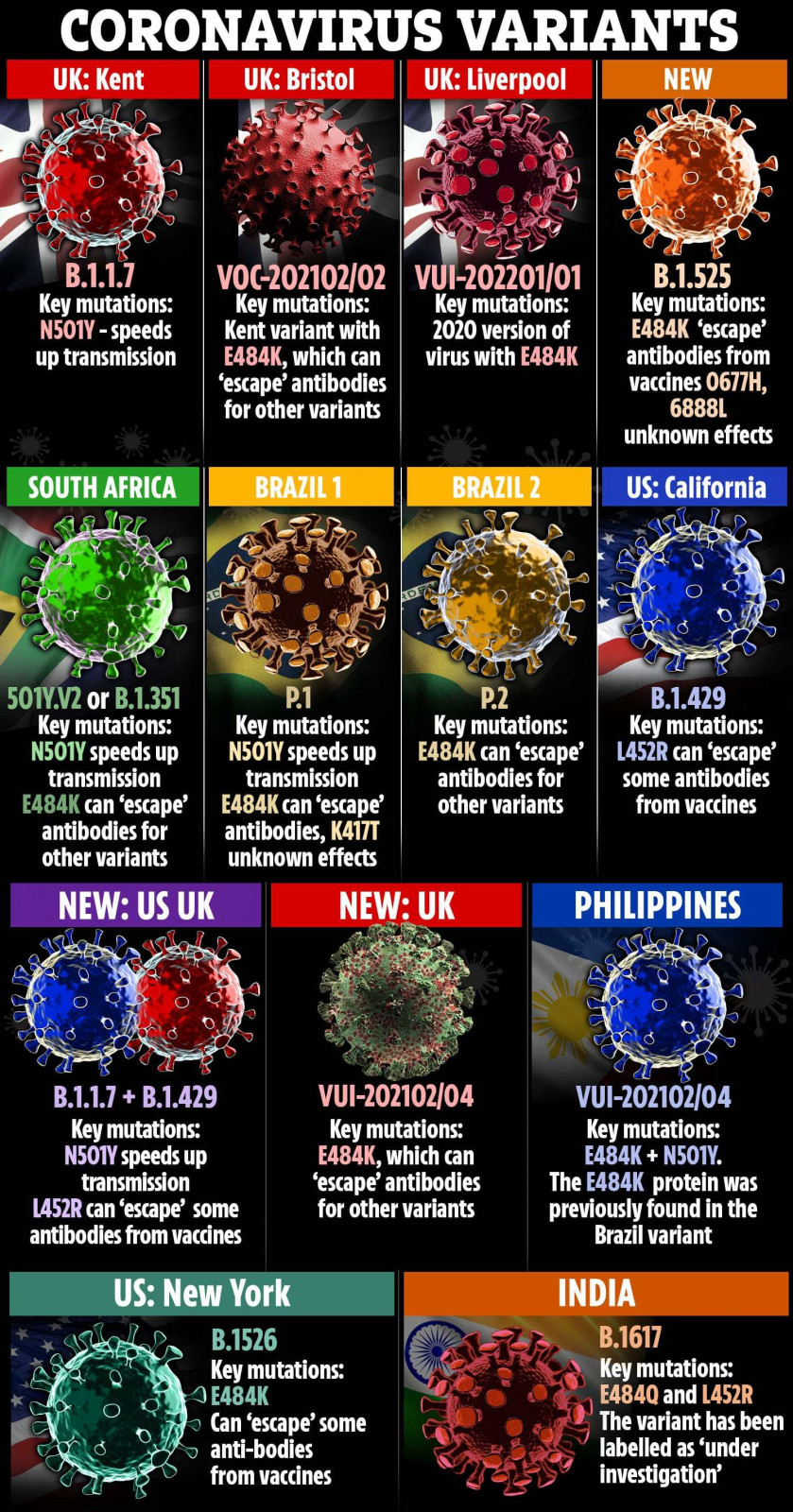 Всички мутации в страната са разделени на два типа - "изследвани варианти" и "предизвикващи безпокойство варианти". Вторите включват откритите в Кент, Бристол, Бразилия и Южна Африка.