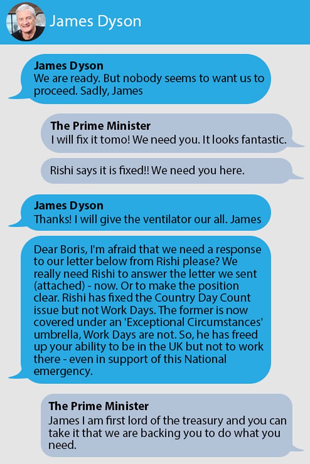 Би Би Си съобщи, че разполага с текстово съобщение на Джонсън от март 2020 година в отговор на искането на Дайсън, чийто бизнес е в Сингапур, за данъците, което гласи „Ще го уредя“. По-късно Джонсън пише отново: „Риши Сунак /министърът на вътрешните работи/ го уреди. Имаме нужда от теб тук“.