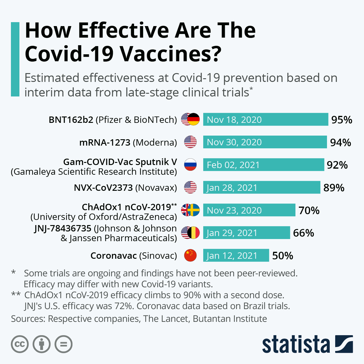 Следват ваксините на Pfizer (поне в 91 страни, 44 процента), Moderna (поне в 46 страни, 22 процента), Синофарм (поне в 41 страни, 20 процента), Sputnik V (поне в 32 страни, 15 процента) и Синовак (поне в 21 страни, 10 процента).