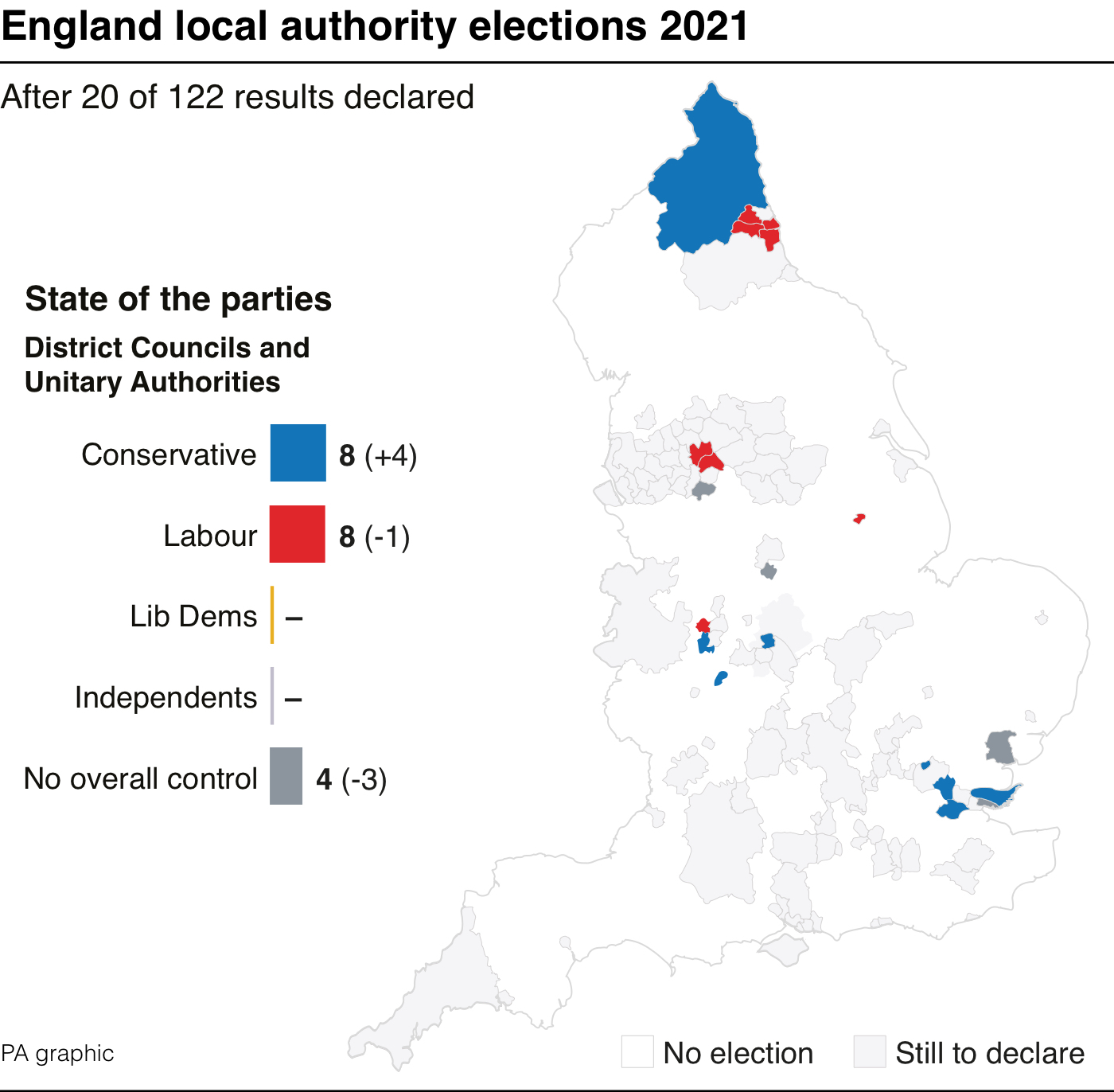 Торите (както се наричат десните консерватори на Острова) получават контрол над общинските съвети в Нортъмбърланд, Харлоу, Редич § Нанитън и Бедуърт при това с голям брой гласове.