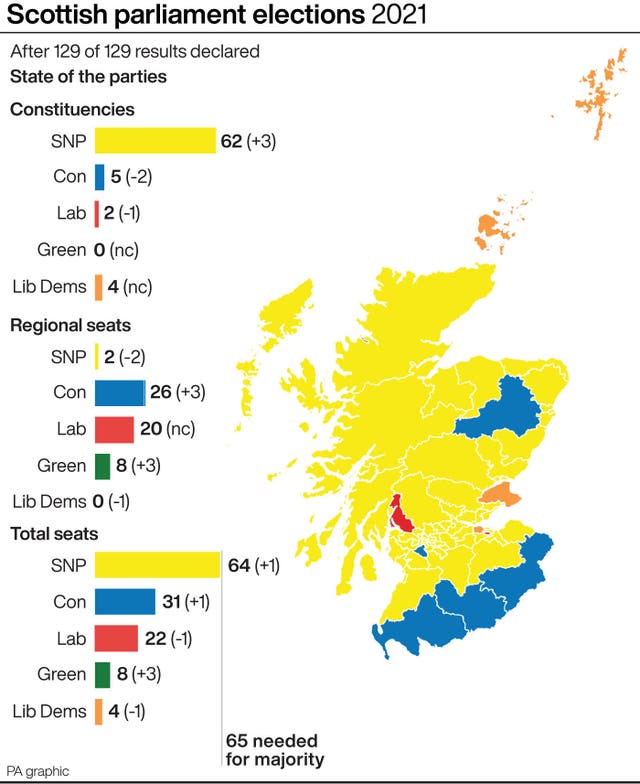 Удар по Борис Джонсън и управляващите тори е и резултатът на изборите в Шотландия, където националистическата партия на Никола Стърджън печели почти пълно мнозинство или 65 места в 130 местния парламент.