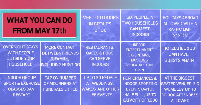 До 30 души могат да присъстват на сватби и погребения. От 17 май ще може да се пътува в чужбина на почивка. Правителството обаче е одобрило досега само 12 безопасни дестинации на принципа на светофара. Пристигащите на Острова само от тези дестинации не трябва да се карантинират.
