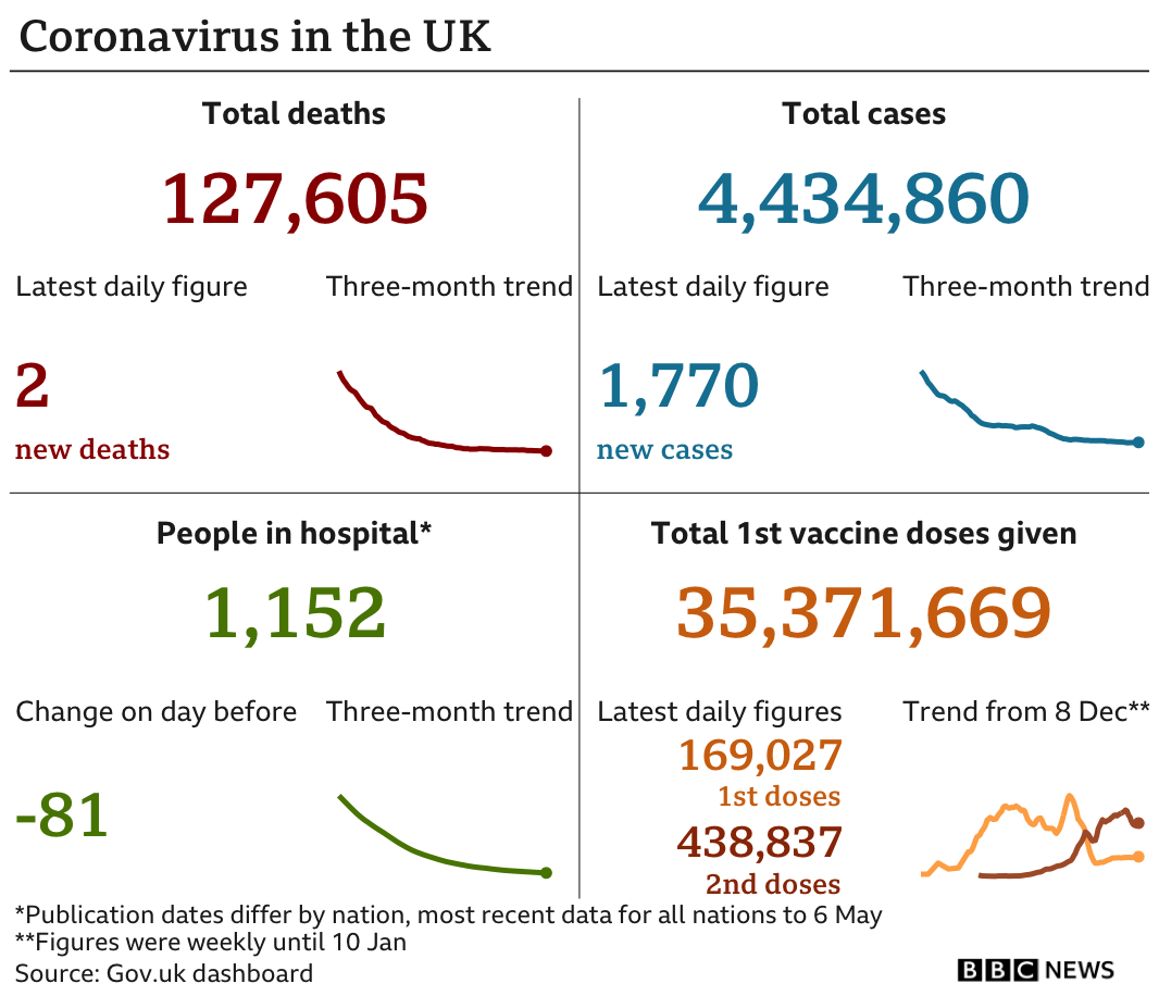 За последното денонощие бяха регистрирани 2 смъртни случая и 1770 заразени. Близо 35,5 и половина британци са получили  първа доза ваксина, 17,6 милиона са напълно ваксинирани след втора доза.