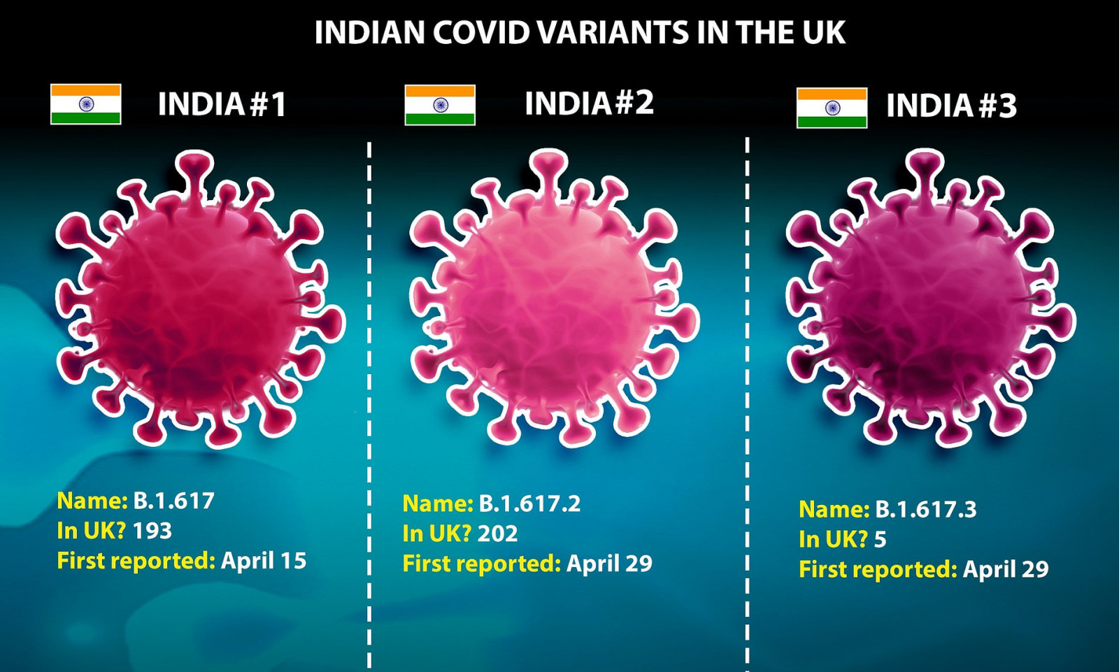 Графика на трите индийски ковид варианта на вируса, засечени във Великобритания.