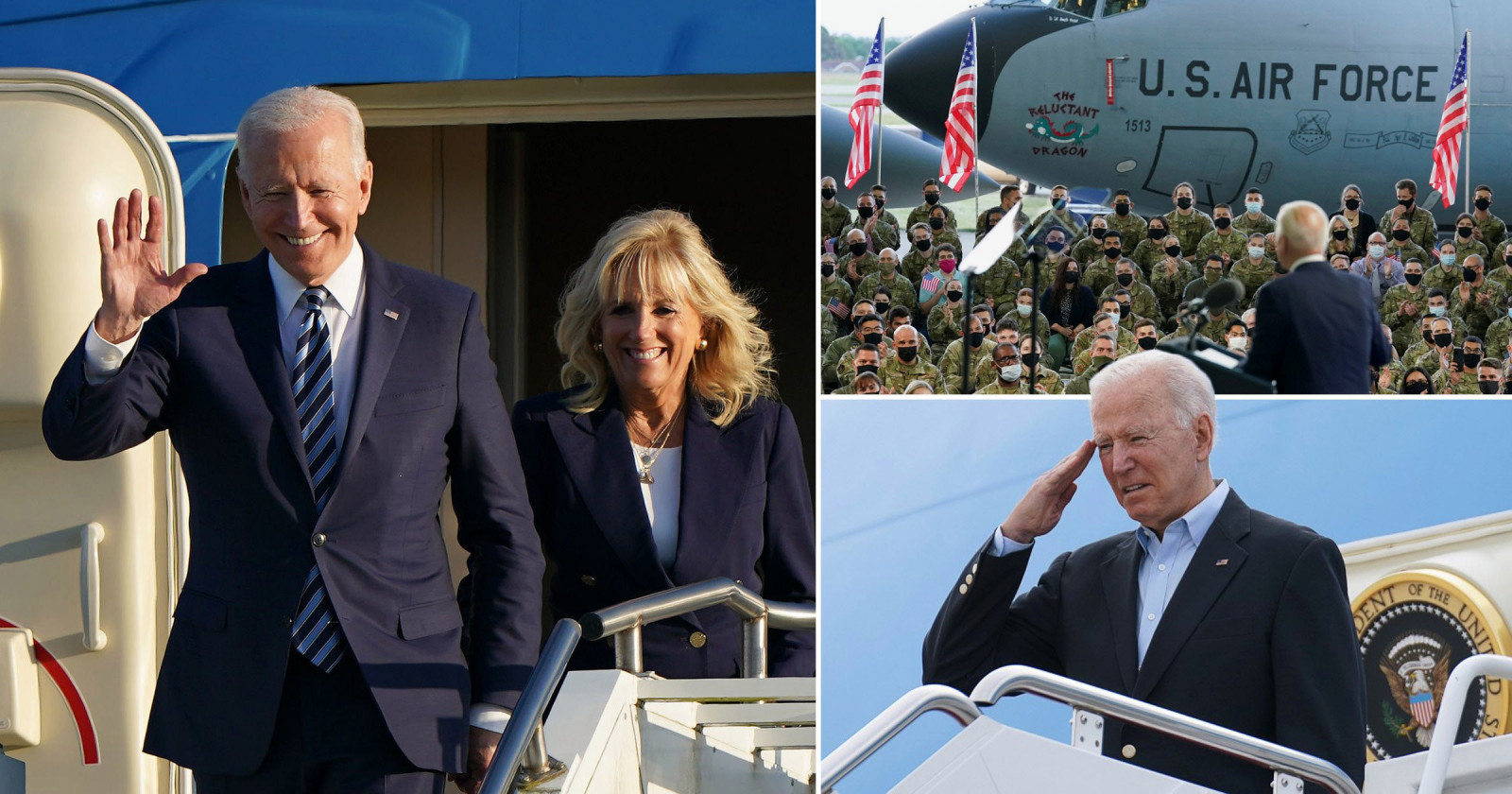 Джо Байдън и първата дама на Америка Джил Байдън кацнаха със самолета Air Force One на летището в базата Милденхол на кралските военновъздушни сили в графство Съфолк.