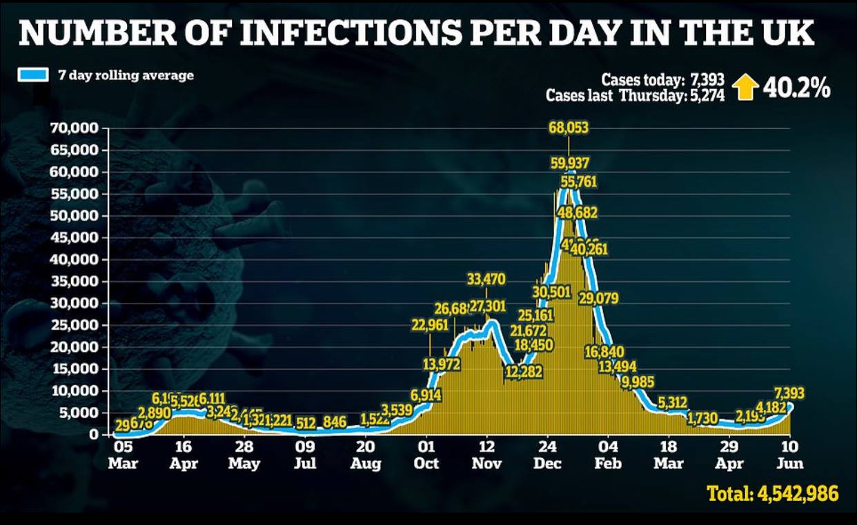 Смята се че всеки 8 от 10 човека, живеещи на Острова има антитела срещу вируса, като те са придобити или след преболедуване или след имунизация. Масовата ваксинация във Великобритания продължава, като всеки ден се ваксинират по няколко десетки хиляди човека.