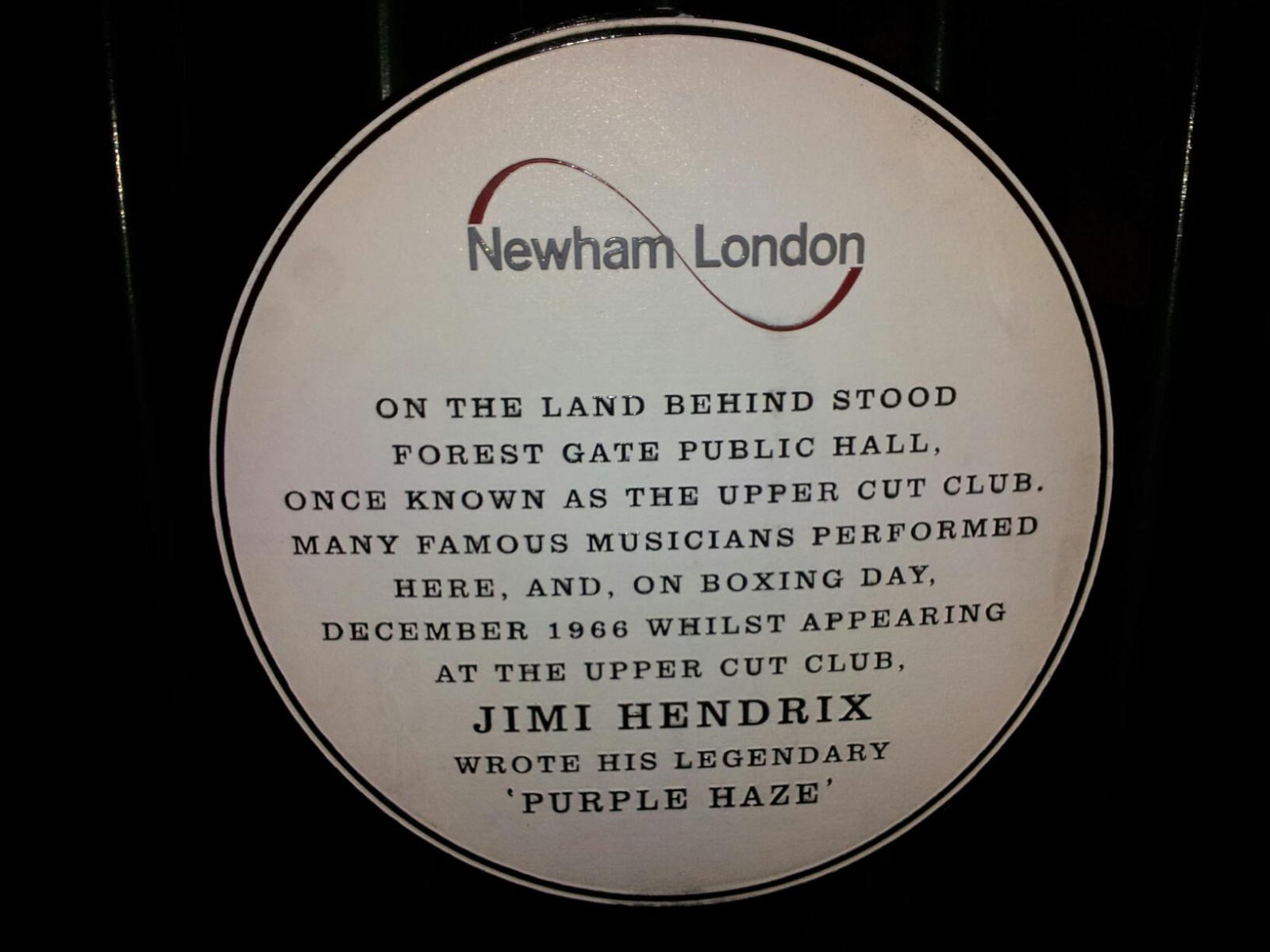 Табелата на снимката маркира мястото, където някога е стоял легендарният клуб "Upper Cut Club" (Forest Gate Public Hall). Датата е 26 декември 1966 година (Boxing Day). Докато се готви да излезе на сцената, великият Джими Хендрикс (Jimi Hendrix) седи в гримьорната. Именно там, в минутите преди шоуто, той написва текста на песента, която ще промени рок музиката завинаги - "Purple Haze".