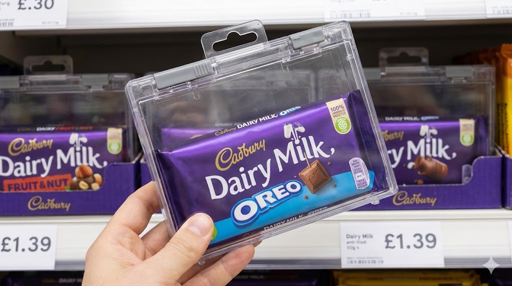 Британските супермаркети започнаха да заключват обикновени шоколади в пластмасови кутии против кражба. Полицията и търговците алармират, че сладките изделия се крадат "по поръчка" от организирани банди и се препродават на черния пазар.