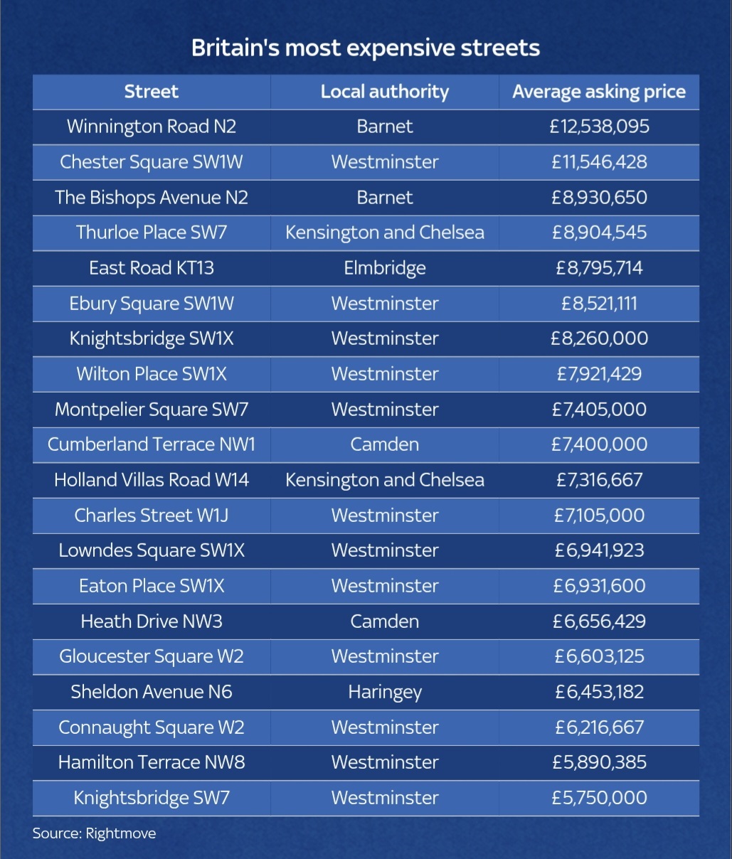 Улица Winnington Road в северен Лондон (район Barnet) отново си върна короната като най-скъпата улица във Великобритания. Средната искана цена за имот там достига зашеметяващите 12 538 095 паунда.
