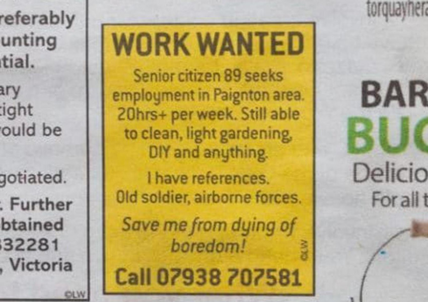 89-годишен мъж публикува обява във вестника,че си търси нова работа, защото „умирал от скука”. Джо Бартли, армейски ветеран от южен Девън, получил много оферти след като пуснал обявата си в „Хералд Експрес”. Обявата гласяла: „Зрял човек на...