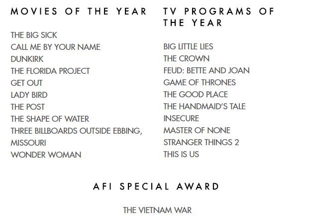 Сред 10-те филма на годината са "Жената чудо", "Вестник на властта", "Дюнкерк". В списъка на 10-те номинирани сериали влизат "Големите малки лъжи", хитовата поредица "Игра на тронове" и "Това сме ние". Специалната награда на АФИ получава "Виетнамската война".