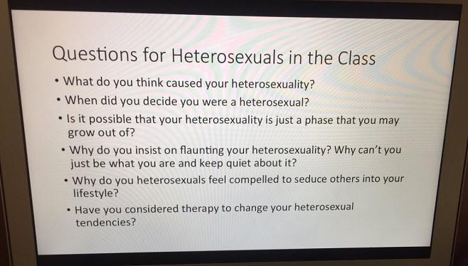 И във връзка с това един гимназиален преподавател се опита да докаже колко нелепи и досадни са някои въпроси, които се задават обикновено на гей хората. Затова и замести думата "хомосексуален" с "хетеросексуален" в няколко подобни въпроса. Целта е ученицте да разберат колко безсмислено е да се пита например "може ли да се излекува хомосексуалността".