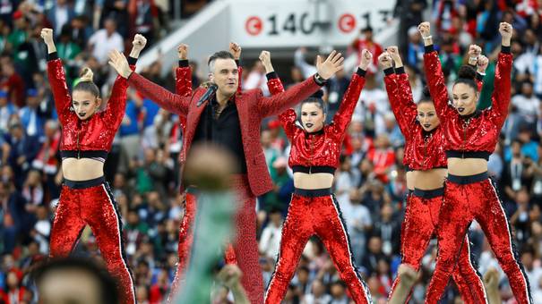 В откриването на Мондиал 2018 участие взеха британският поппевец Роби Уилямс, който, върху импровизирана сцена, наподобяваща футболна топка, изпя части от най-големите си хитове заедно с оперната певица от Татарстан Аида Гарифулина.
