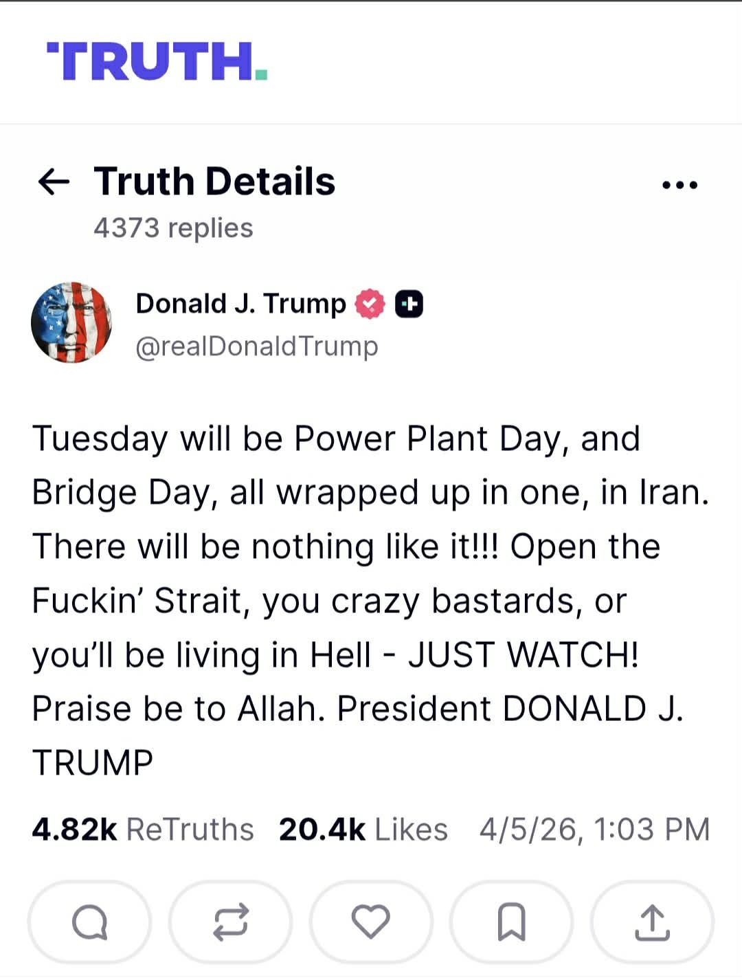 В публикация в своята платформа Truth Social, президентът Тръмп използва изключително остър език, призовавайки Иран да пусне търговските кораби: "Отворете шбания проток, вие луди кпелета, или ще живеете в Ада - ПРОСТО ГЛЕДАЙТЕ! Слава на Аллах. Президент ДОНАЛД Дж. ТРЪМП"